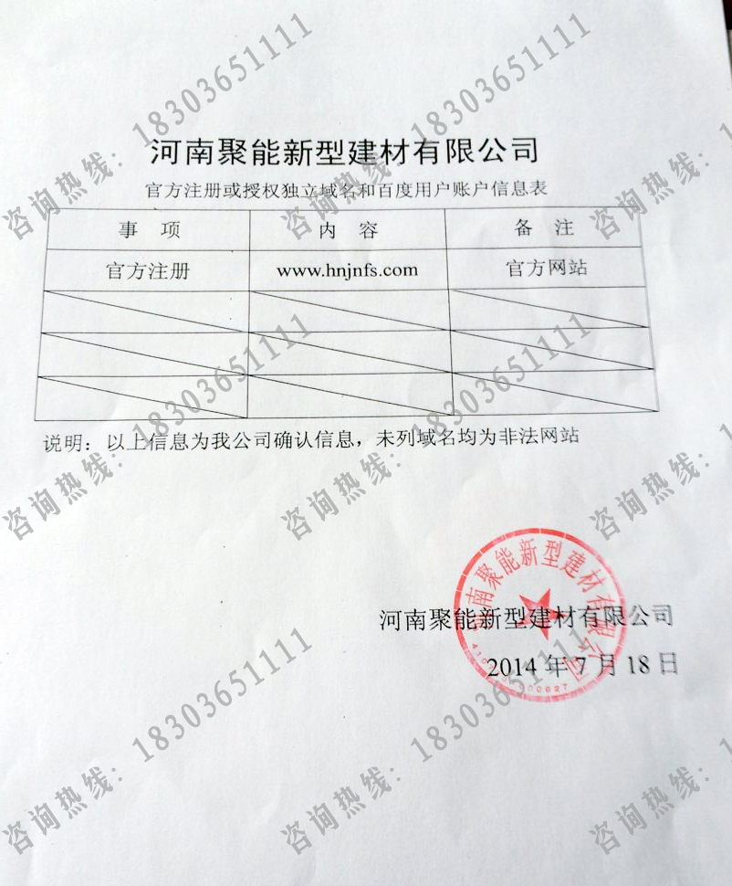 近發(fā)現(xiàn)一些非聚能內(nèi)部人員以我公司名義私自建立網(wǎng)站以及網(wǎng)絡(luò)推廣,在此提醒各位:咨詢(xún)請(qǐng)謹(jǐn)慎,購(gòu)買(mǎi)我公司產(chǎn)品更是謹(jǐn)慎,認(rèn)準(zhǔn)河南聚能新型建材有限公司唯一官方網(wǎng)站:http://xiaozhongdai.cn